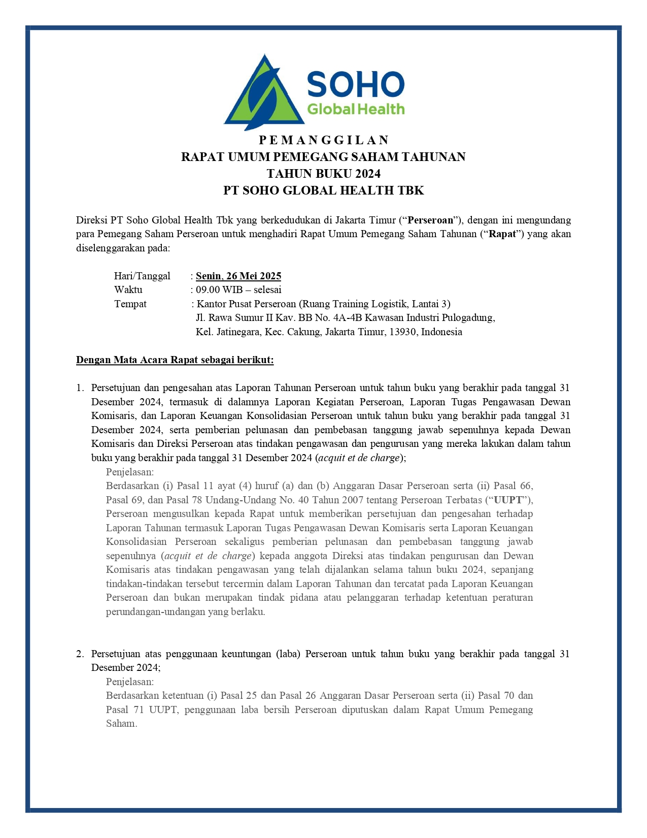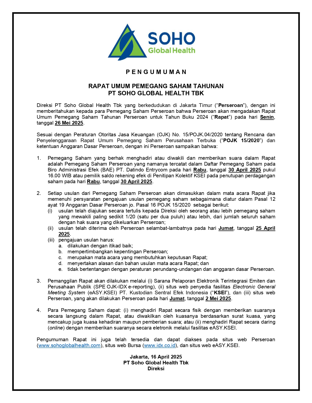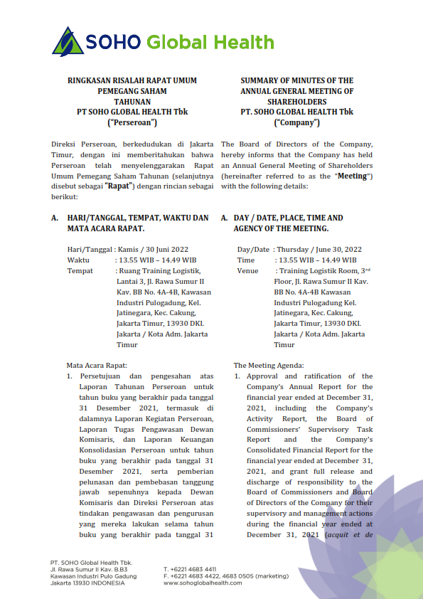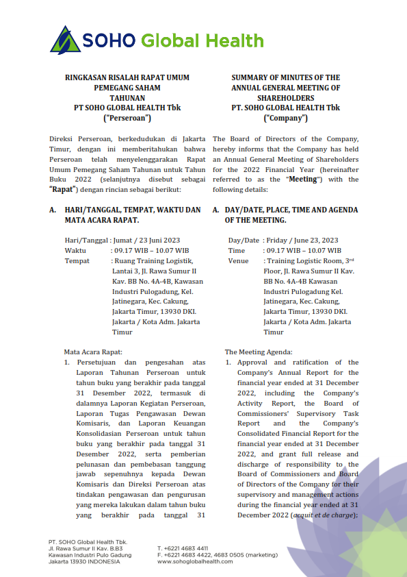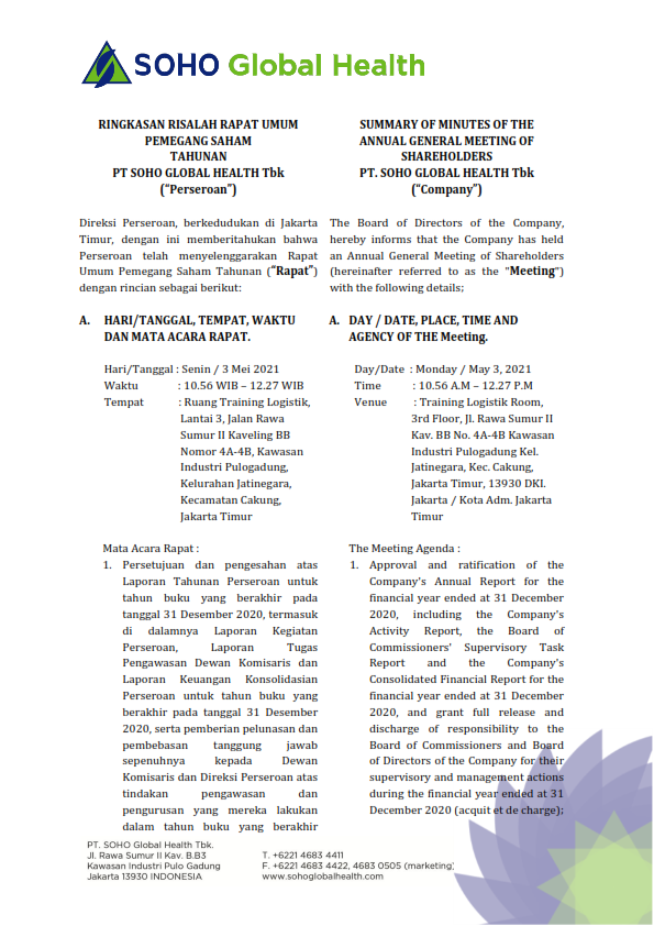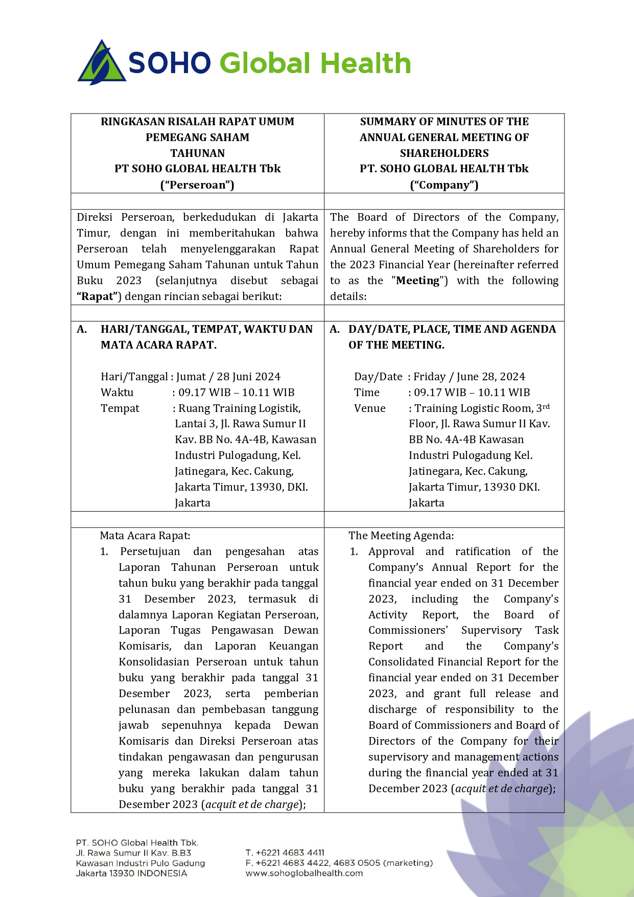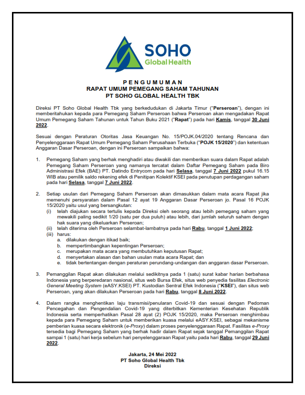 | Contact | Corporate Secretary Tel : 62-21-2985-88888 Fax : 62-21-2985-8800 E-mail : corporate.secretary@sohoglobalhealth.com |