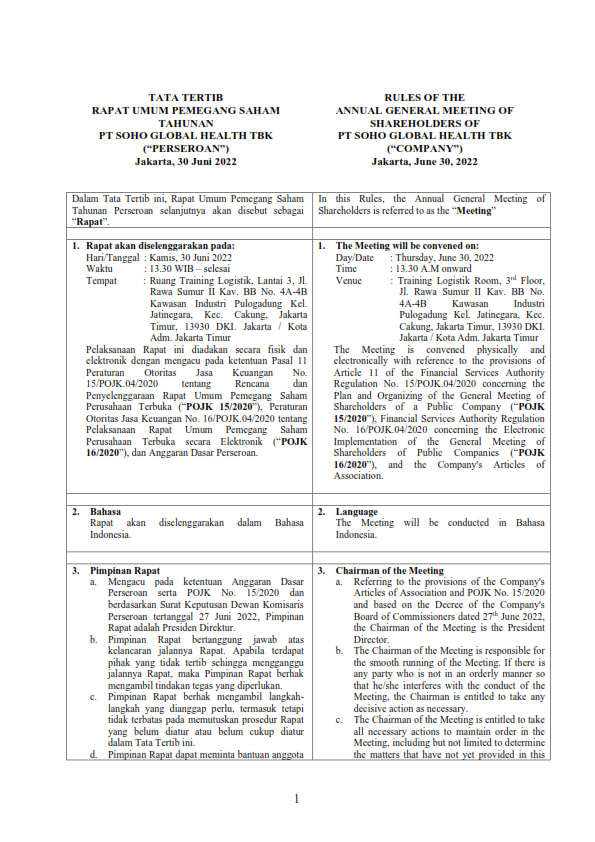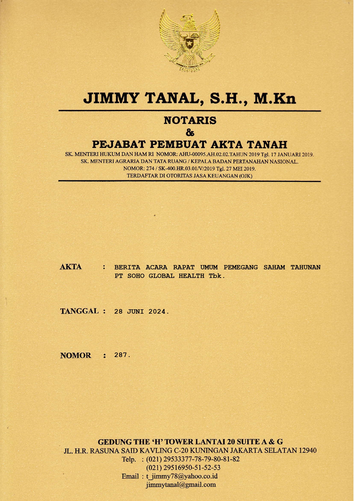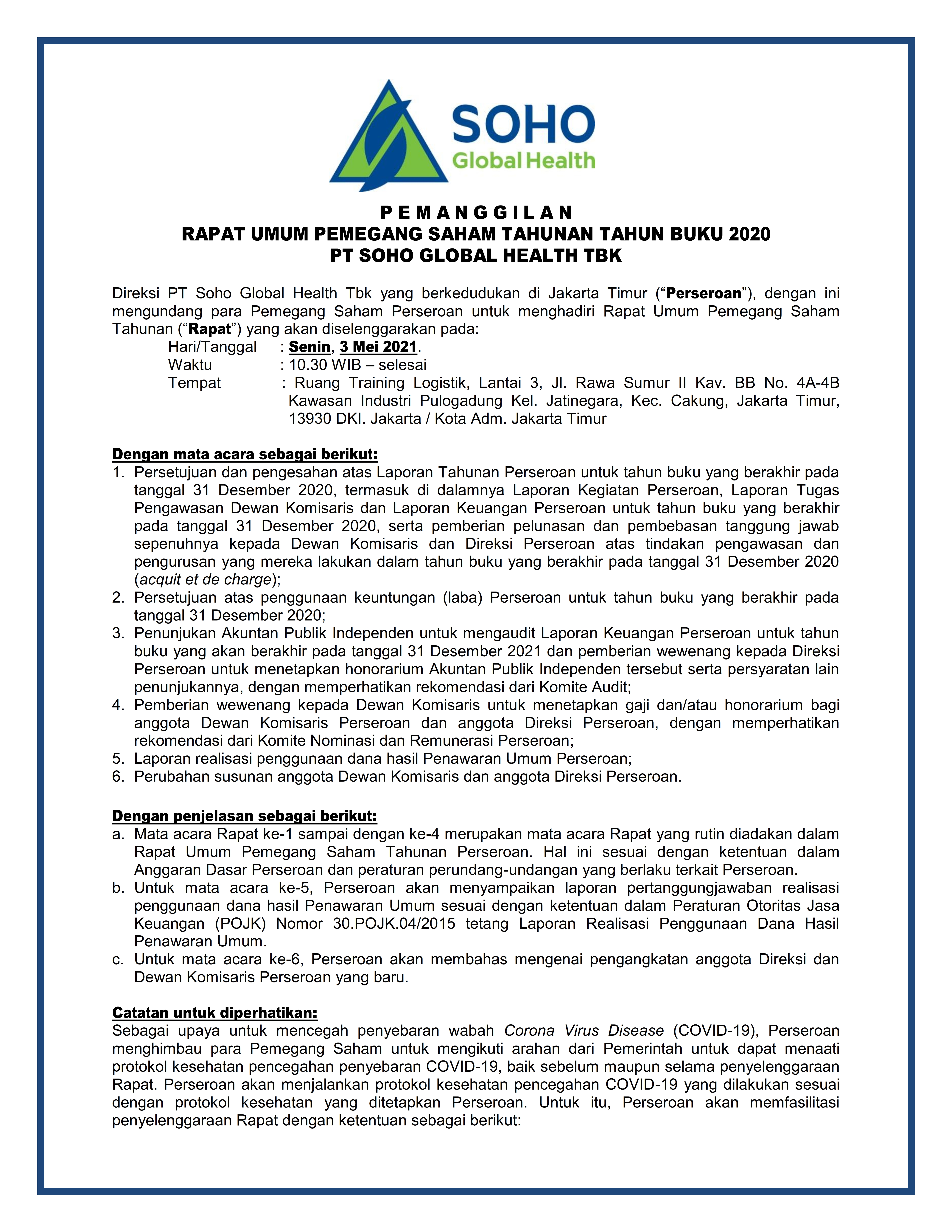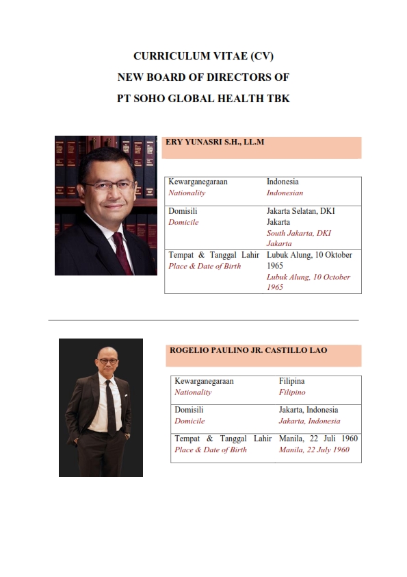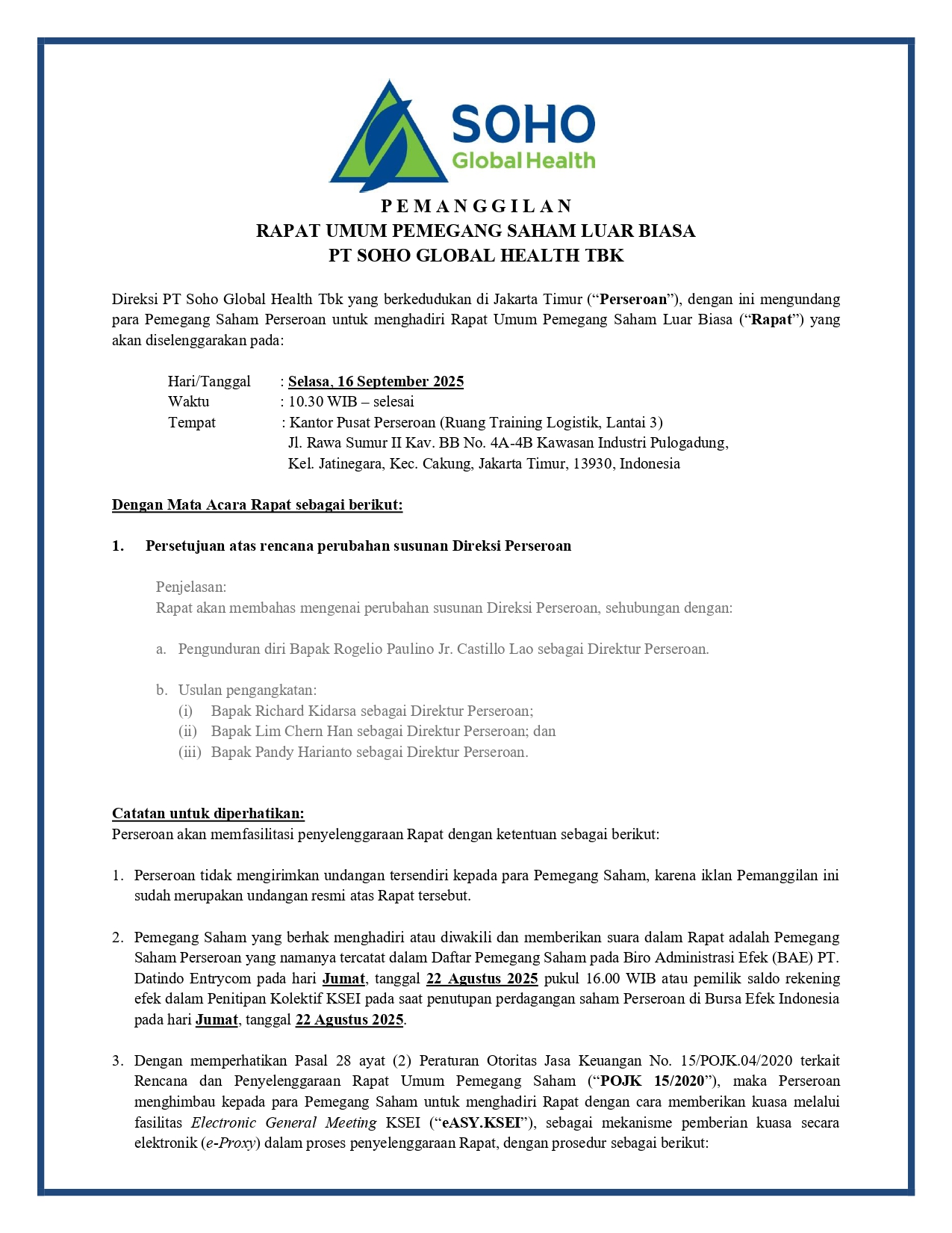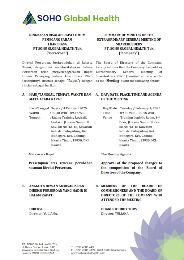 | Contact | Corporate Secretary Tel : 62-21-2985-88888 Fax : 62-21-2985-8800 E-mail : corporate.secretary@sohoglobalhealth.com |