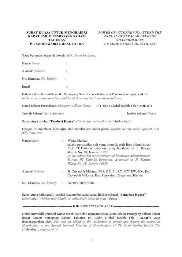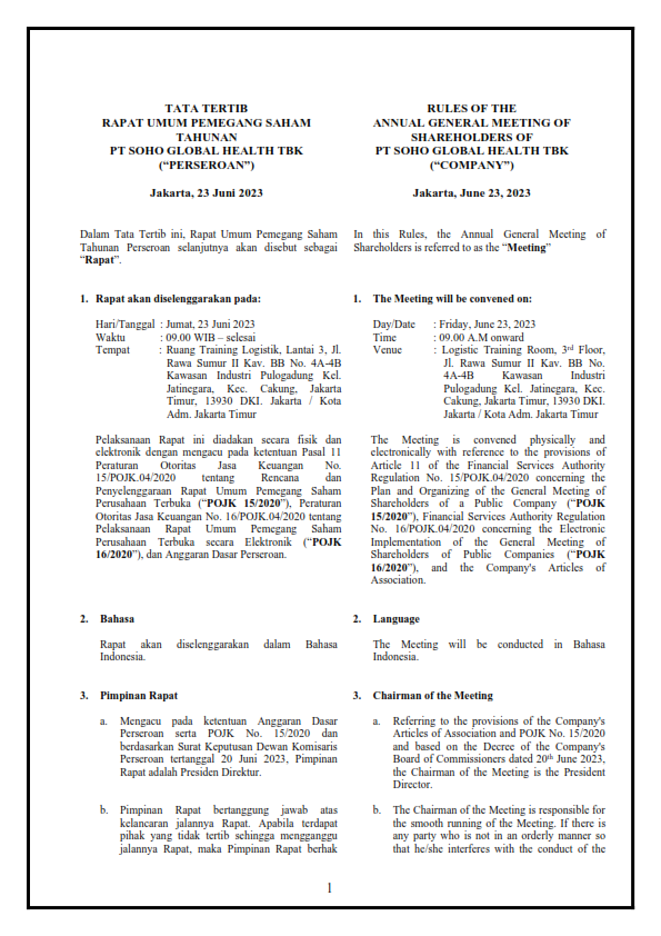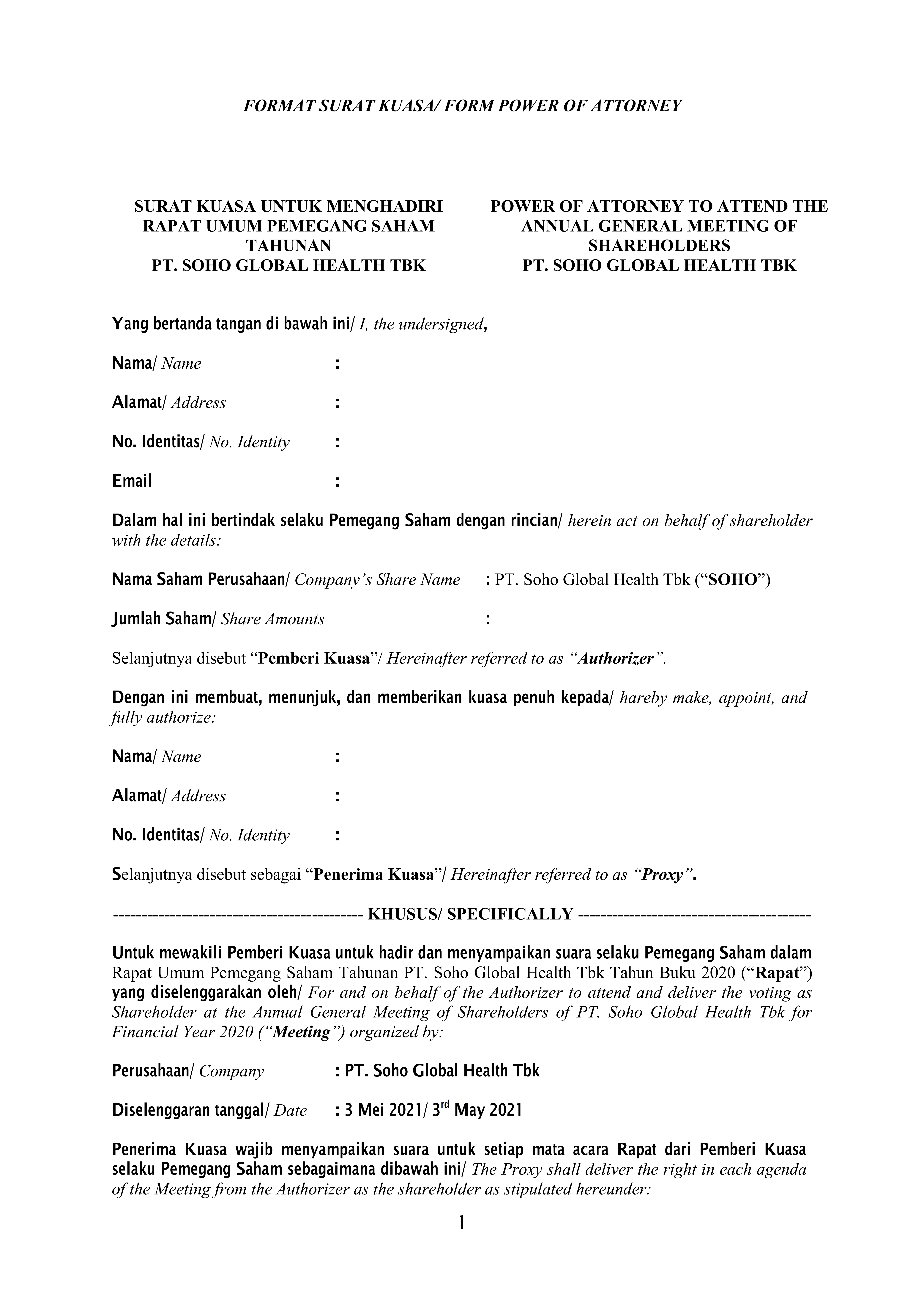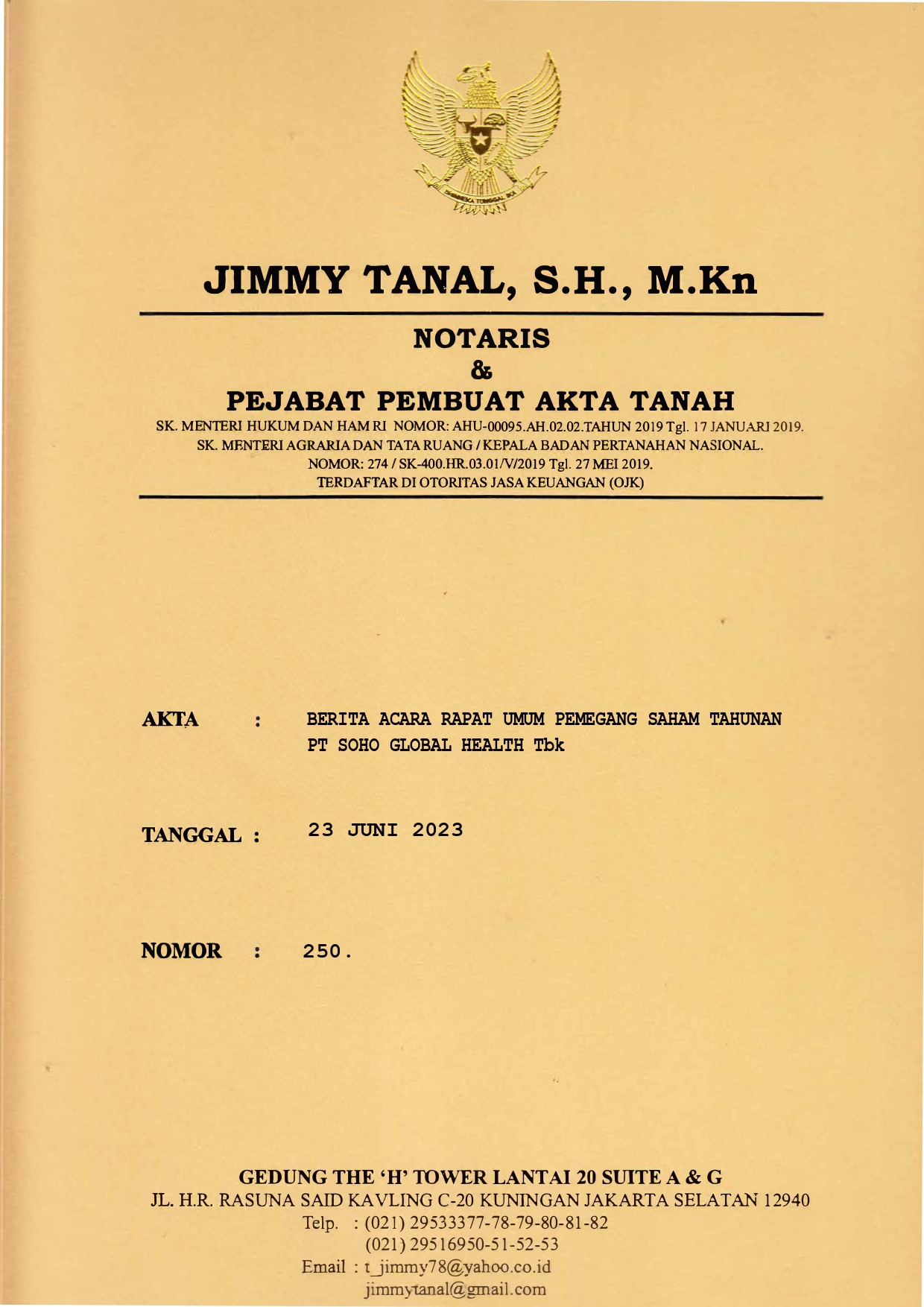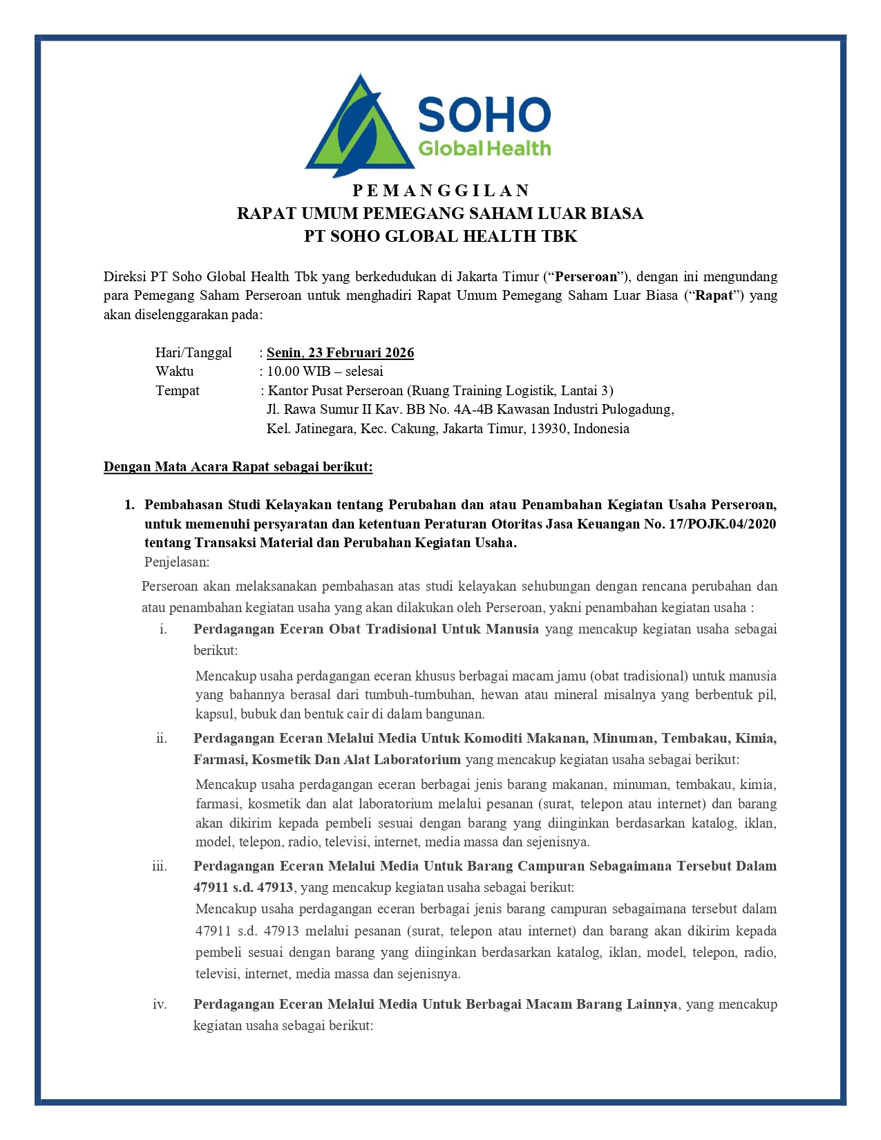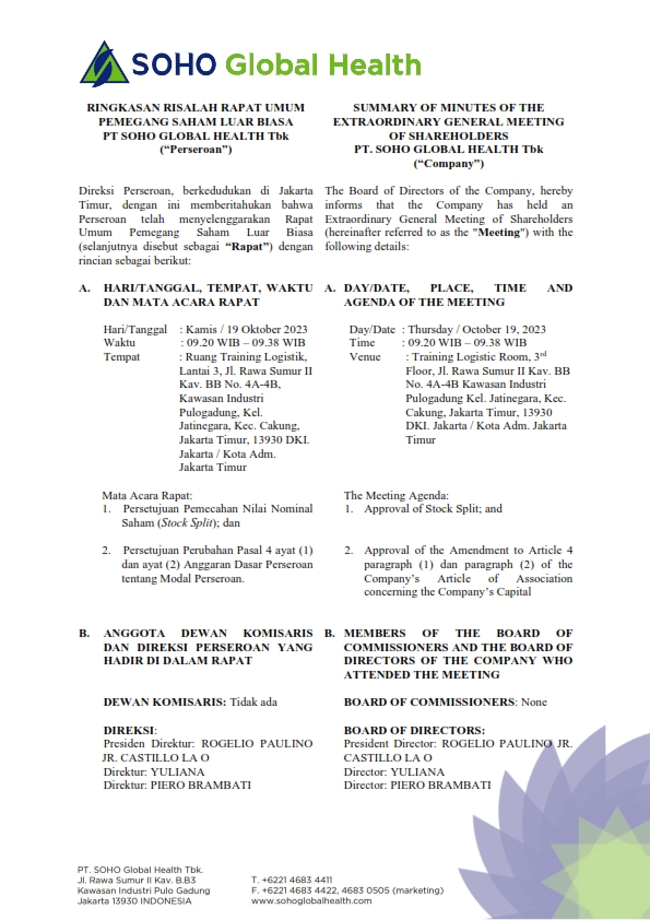 | Contact | Corporate Secretary Tel : 62-21-2985-88888 Fax : 62-21-2985-8800 E-mail : corporate.secretary@sohoglobalhealth.com |