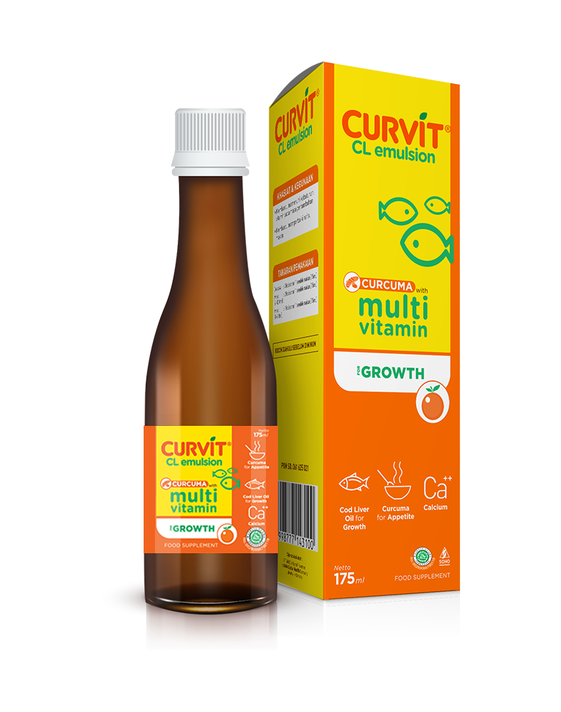 Each 15 ml (1 tablespoon) of Curvit CL Emulsion contains: Cod liver oil 7,5 mg, Curcuma extract 10 mg, Ca. Hypophosphite 500 mg, AA 15 mg, DHA 10 mg, FOS 500 mg, Vit A 850 IU, vit B1 3 mg, Vit B2 2 mg, Vit B6 5 mg, Vit B12 5 mcg, dexpanthenol 3 mg, Vit D 100 IU,