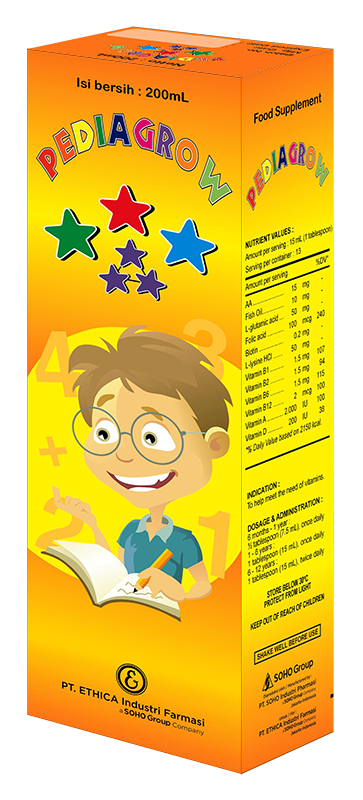 Each 15 ml of Pediagrow contains: AA 15 mg, DHA 10mg, EPA 2mg, L-glutamic acid 50mg, Folic acid 100mcg, biotin 0.2 mg, Lysine HCL 50mg, Vit B1 1.5mg, B2 1.5 mg,B6 1.5mg, B12 2mcg, Vit A 2000IU, Vit D 200IU