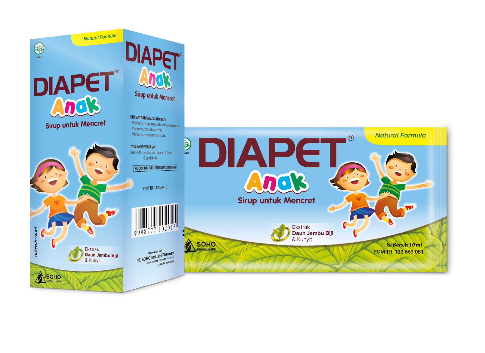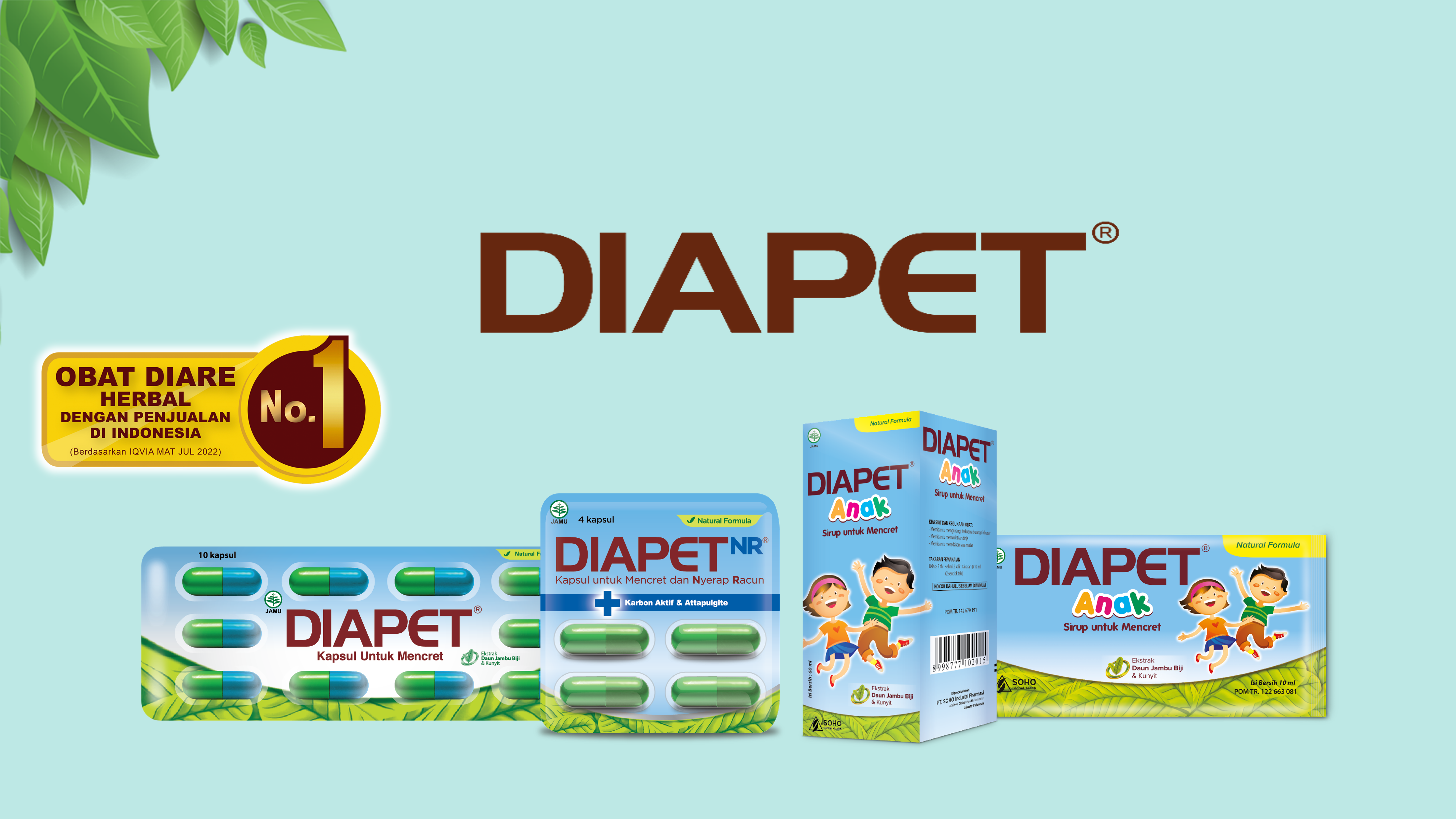 For adults with diarrhea, Diapet regular capsules and Diapet NR (Toxin Absorber) are available. For children aged 5 years and above with diarrhea, Diapet Children's syrup is available in both bottle and practical sachet forms.