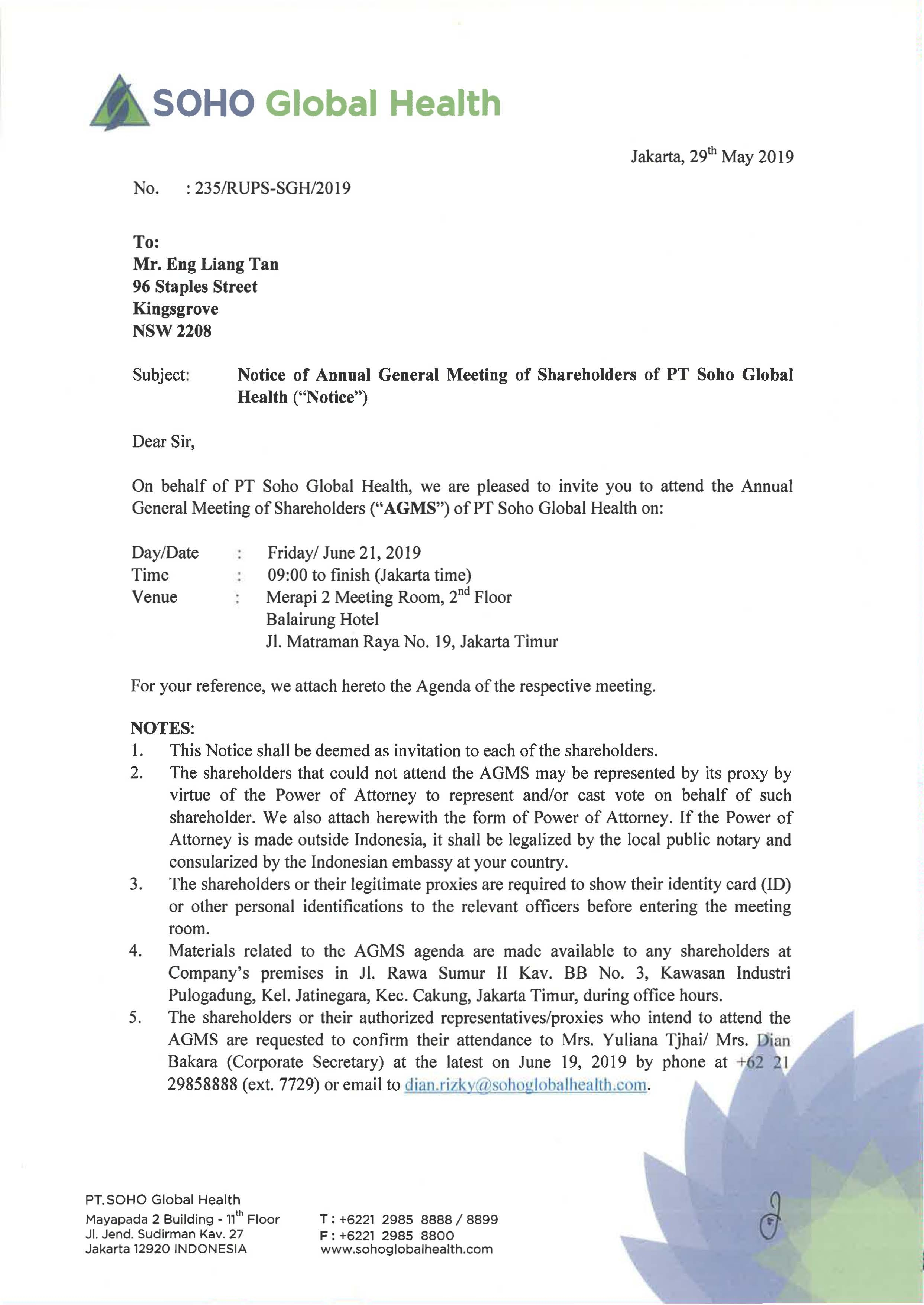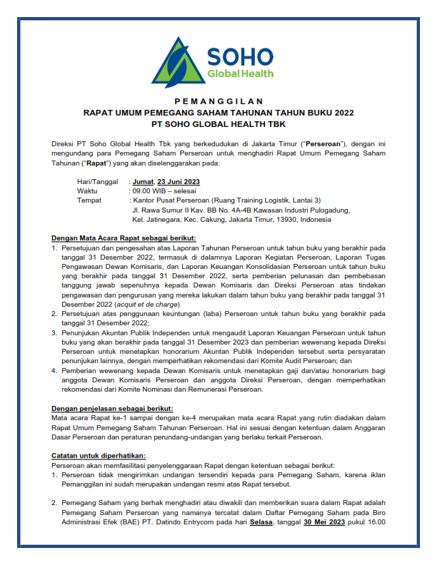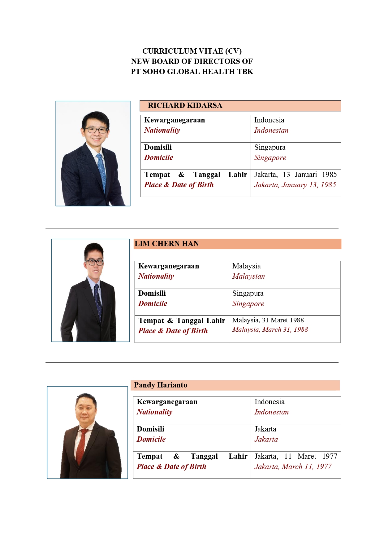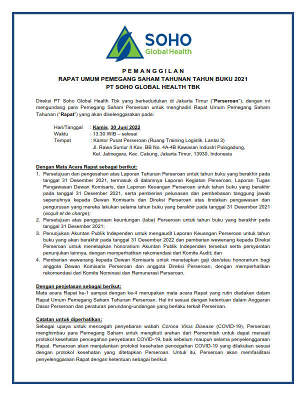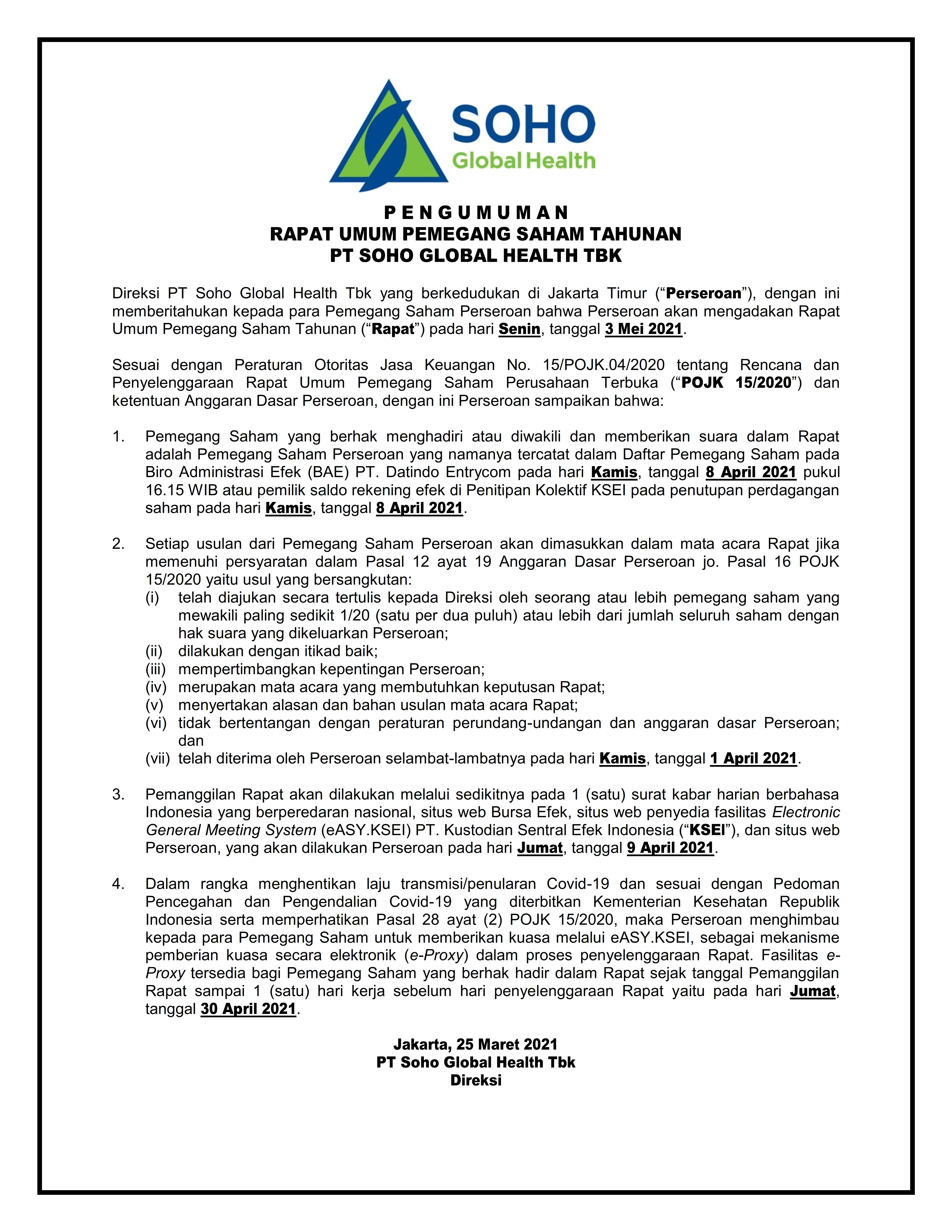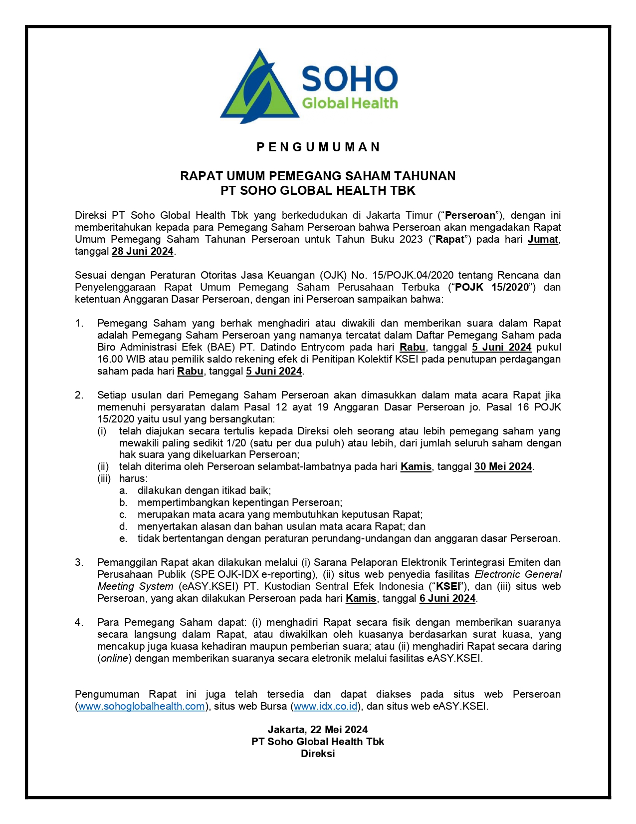 | Contact | Corporate Secretary Tel : 62-21-2985-88888 Fax : 62-21-2985-8800 E-mail : corporate.secretary@sohoglobalhealth.com |