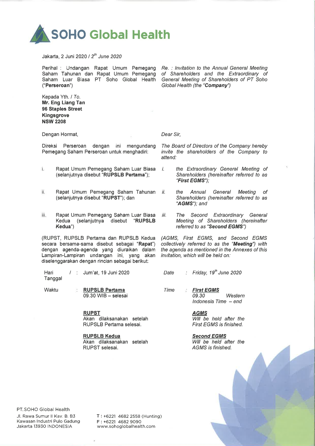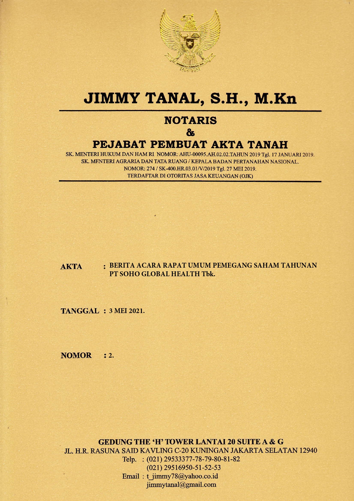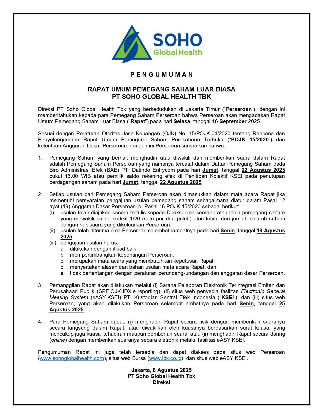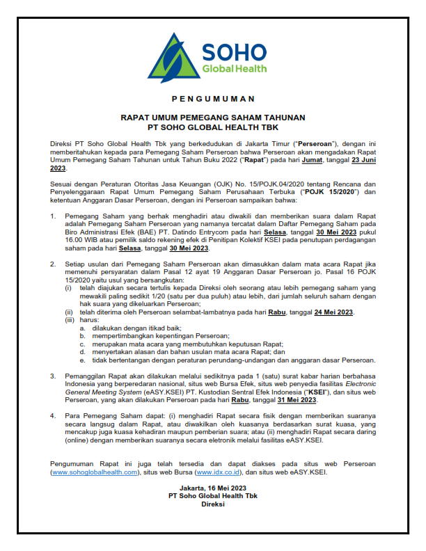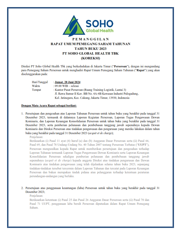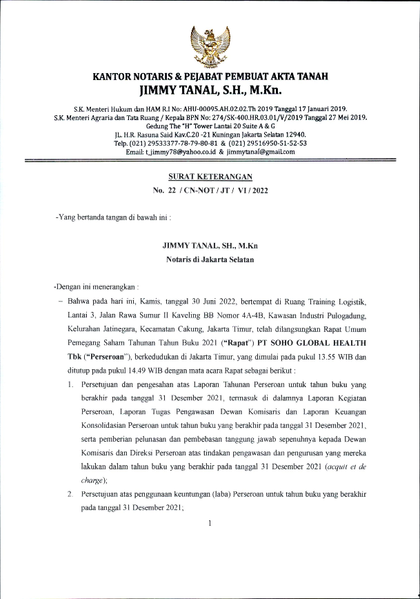 | Contact | Corporate Secretary Tel : 62-21-2985-88888 Fax : 62-21-2985-8800 E-mail : corporate.secretary@sohoglobalhealth.com |