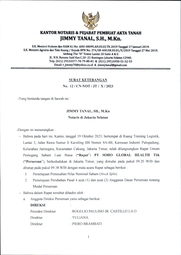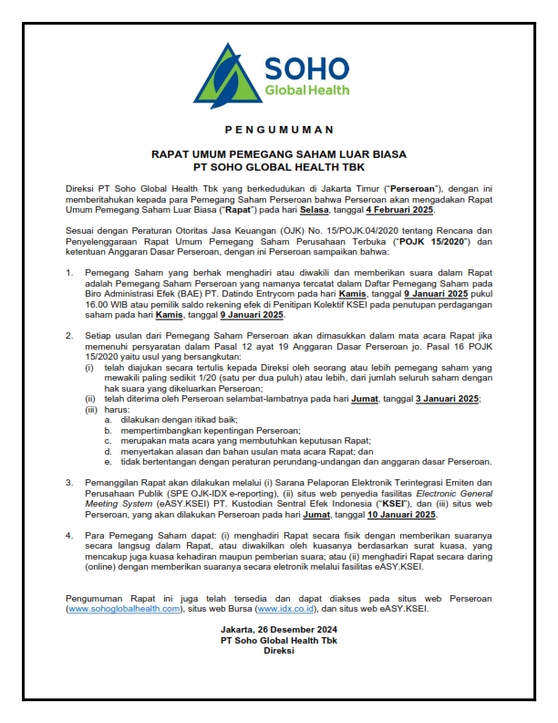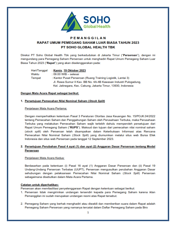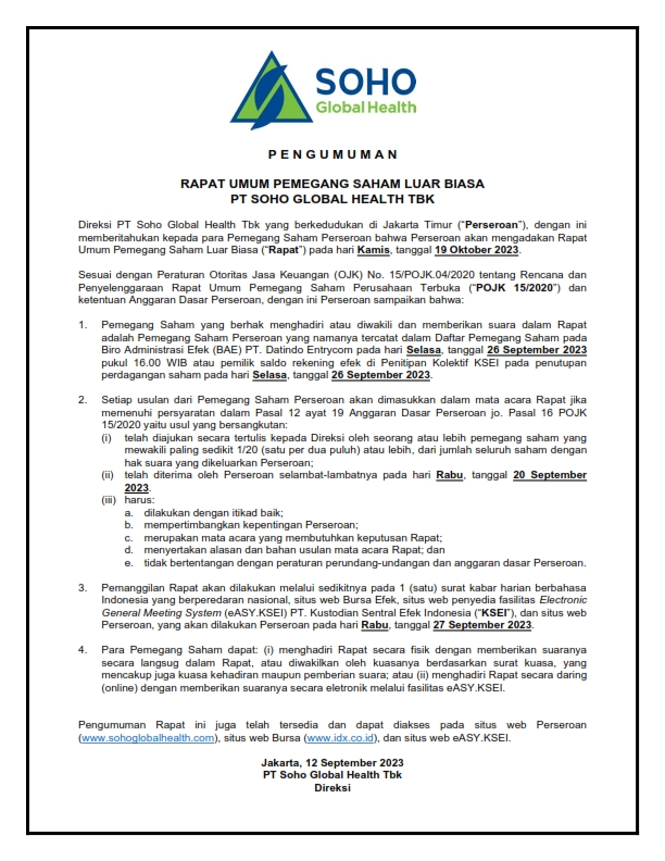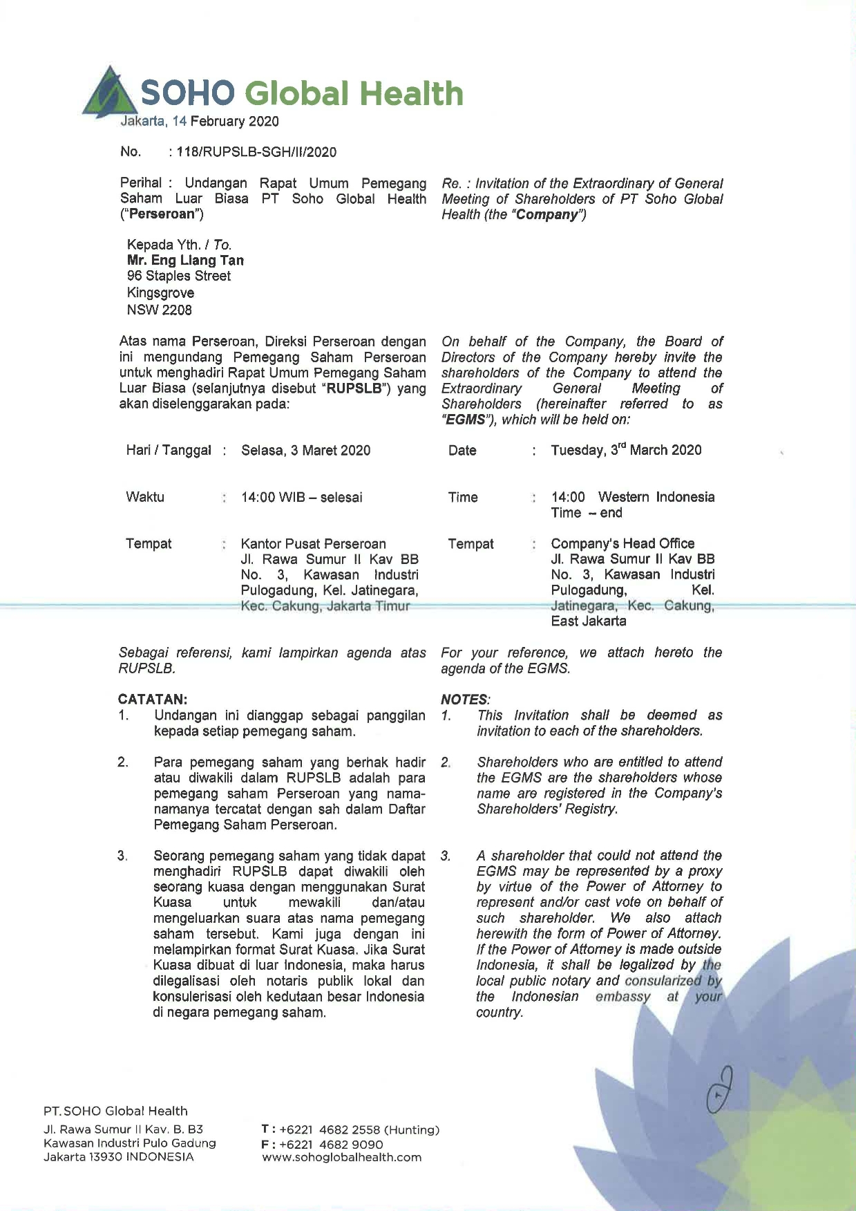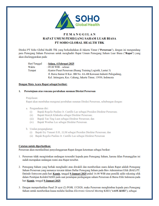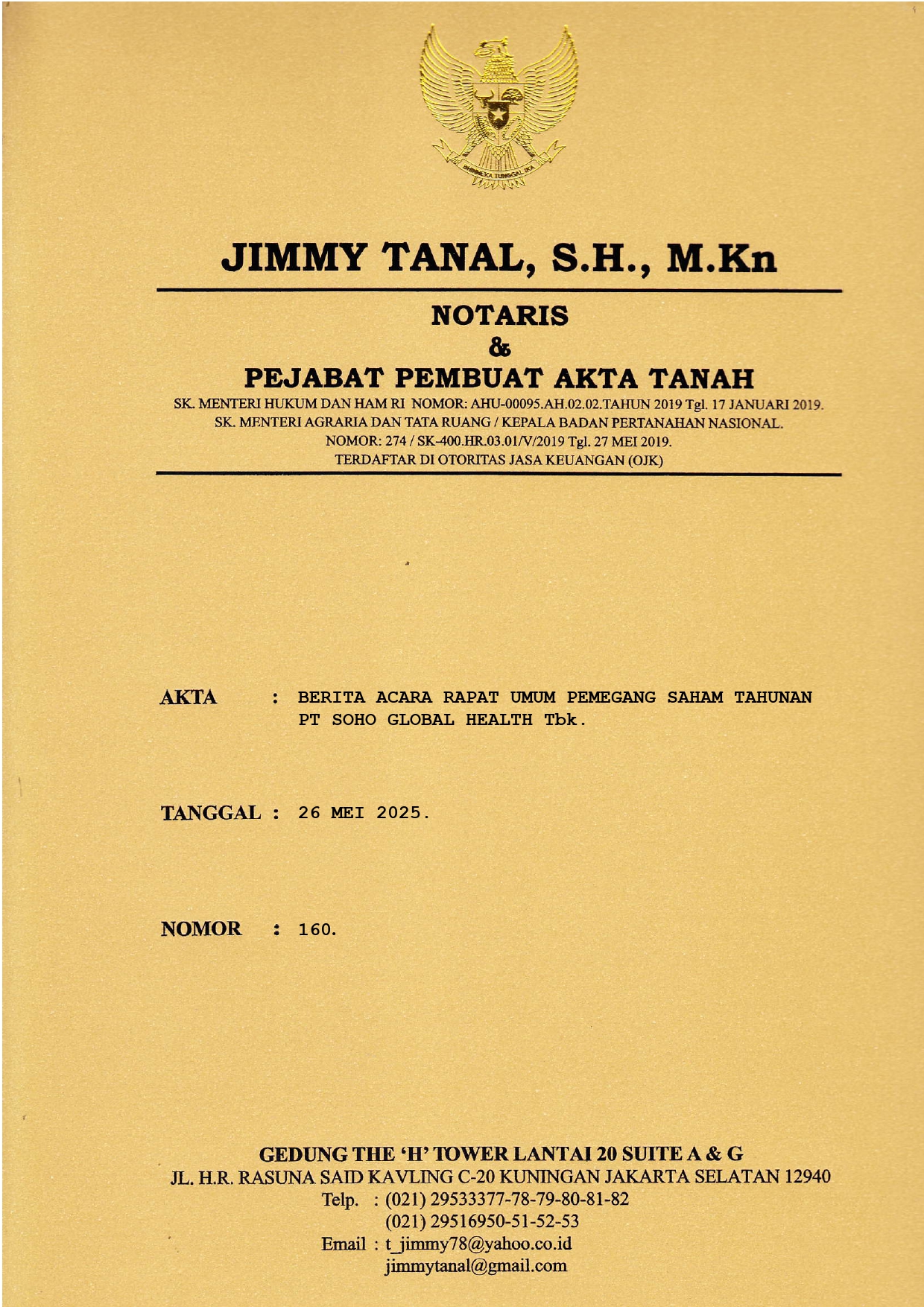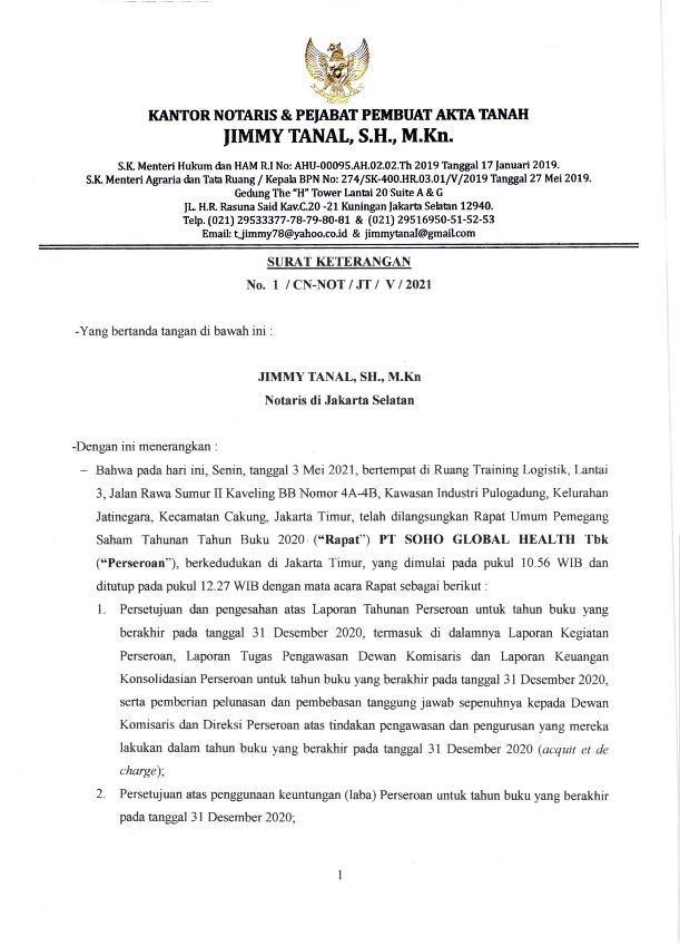 | Contact | Corporate Secretary Tel : 62-21-2985-88888 Fax : 62-21-2985-8800 E-mail : corporate.secretary@sohoglobalhealth.com |