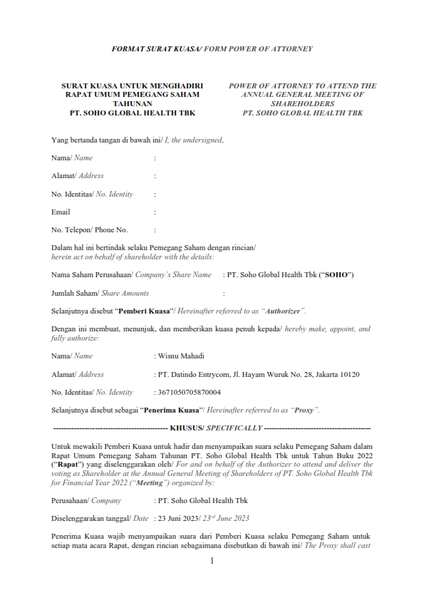 [TEMPLATE] Power Attorney to Attend Annual General Meeting Shareholders Financial Year 2022 - Independent Representative
