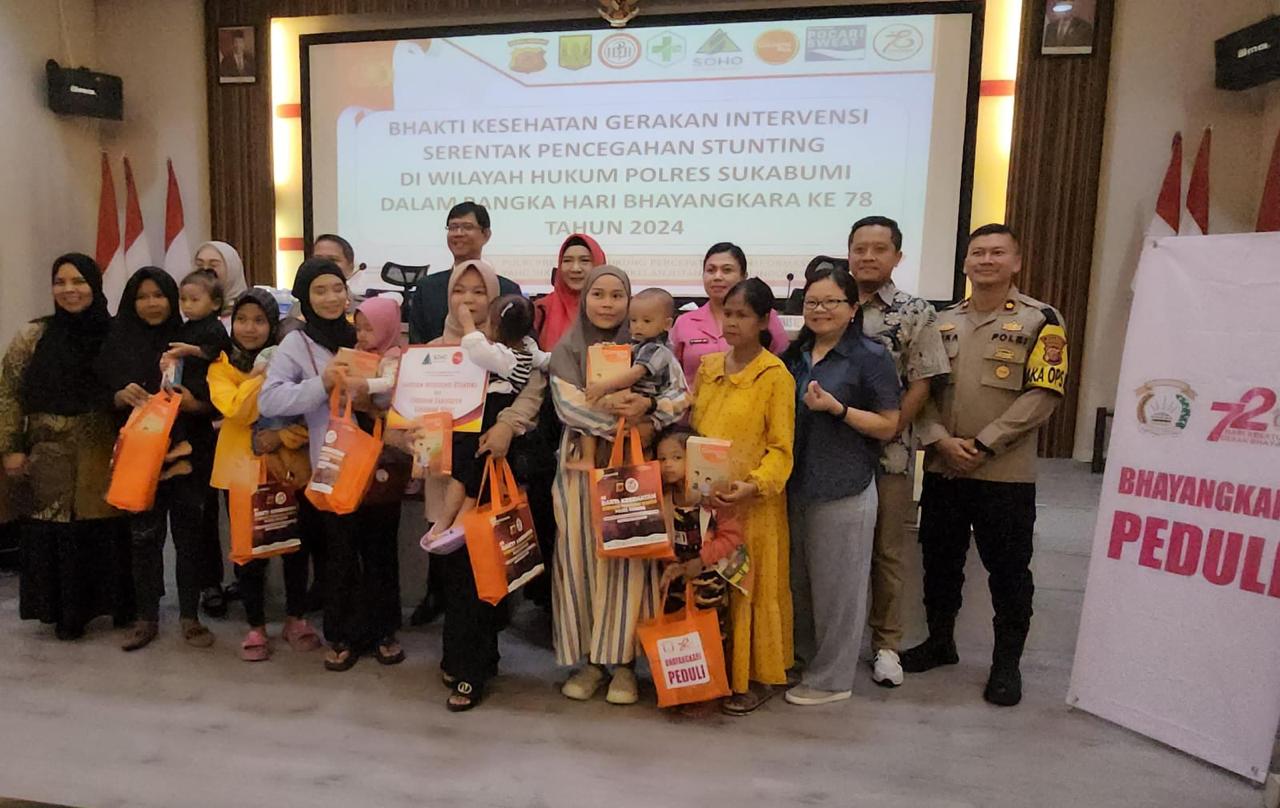 The symbolic event for the handover of CSR assistance for the stunting intervention movement was held in the Sukabumi Police Headquarters Hall, Jl. Sudirman 12, Palabuhanratu, Sukabumi Regency on June 26, 2024. The event was held in commemoration of the 78th Bhayangkara Day and was attended by the Head of the Sukabumi Regency Health Office, the Chairman of the Sukabumi Regency Branch of the Indonesian Doctors Association (IDI), the Chairman of the Sukabumi Regency Branch of the Indonesian Village Government Association (APDESI), the Head of Palabuhanratu Community Health Center, the Head of the Sukabumi Regency Police, and other related officials.
